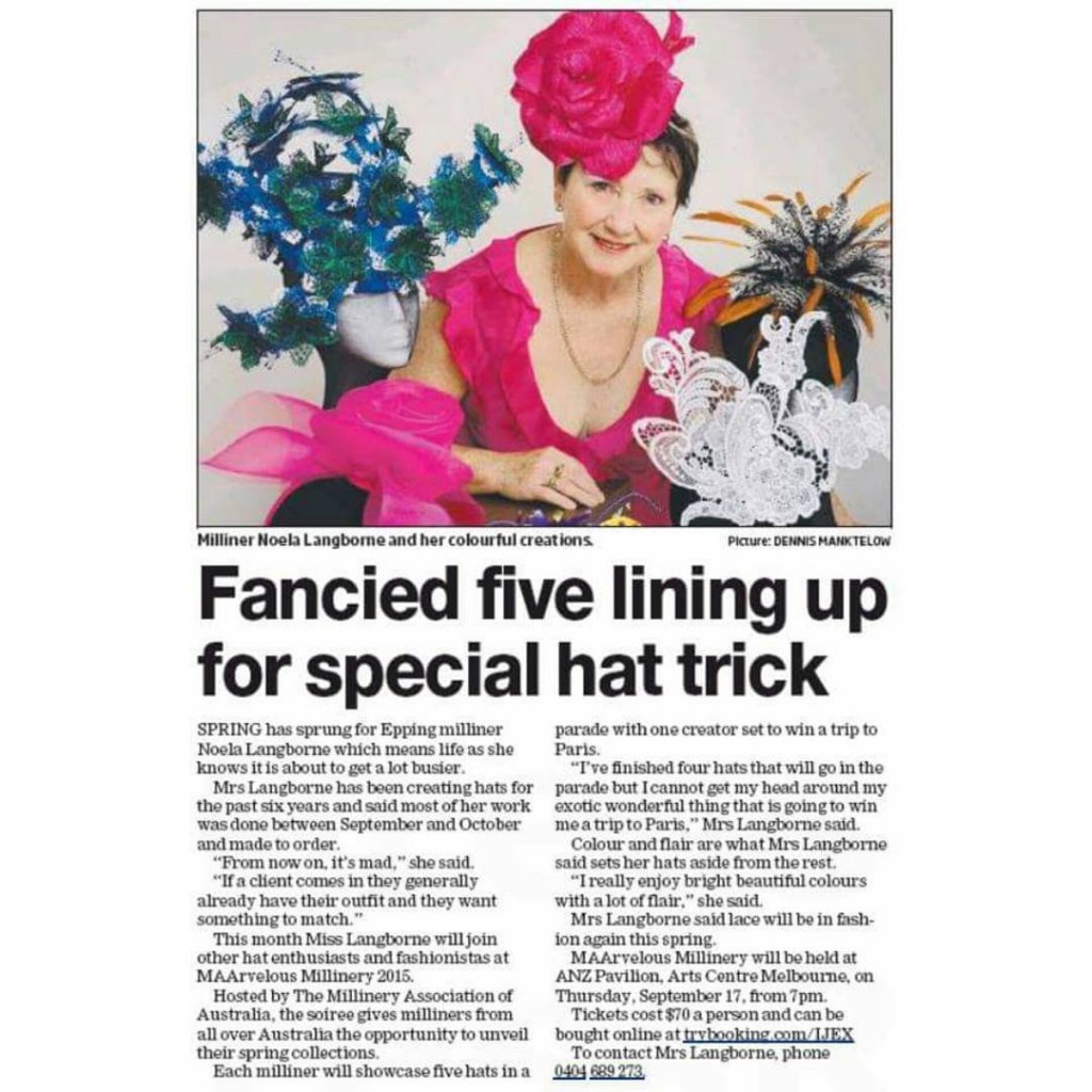 11875379_951182218285505_647570729_n MAArvelous Millinery Milliner Noela Langborne featured on the Whittlesea Leader #maarvelousmillinery #maa #millineryaustralia #millineryaustralia #newspaper #feature
